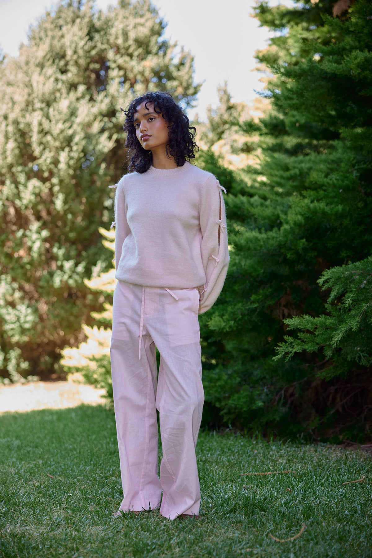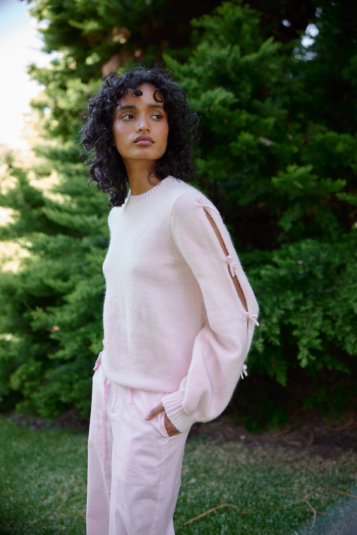Introducing the Mabel Jumper Baby. Delicately adorned with bow-tied cutouts along the sleeves, this statement knit is the perfect blend of comfort and sophistication.