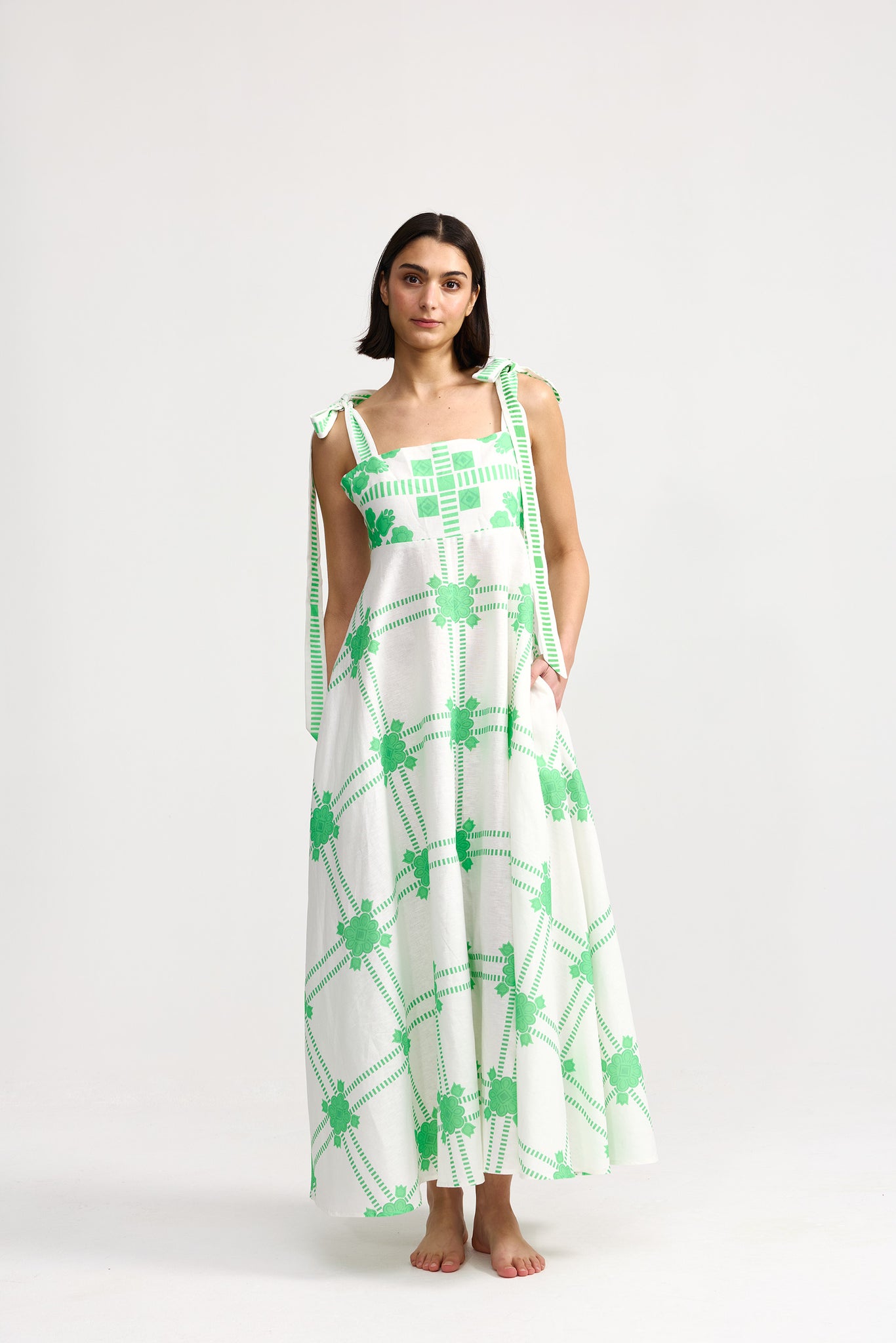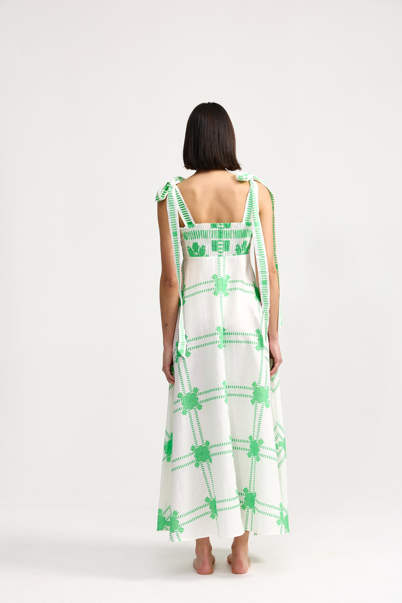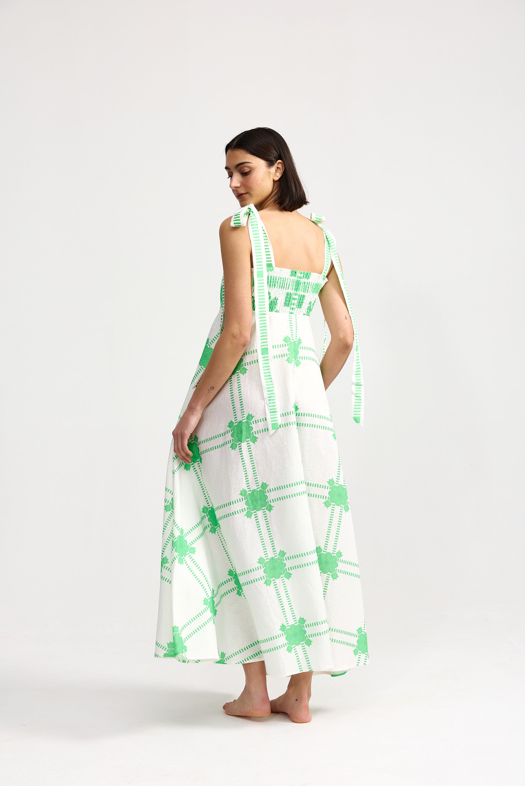 The Pippa Dress Mediterranean Fern is a timeless a-line dress that beautifully balances elegance and comfort. Featuring a fitted bodice with a flattering square neckline and tie-up straps, it's crafted in our exclusive Mediterranean print. Perfect for any occasion, the Pippa dress effortlessly transitions from day to evening.