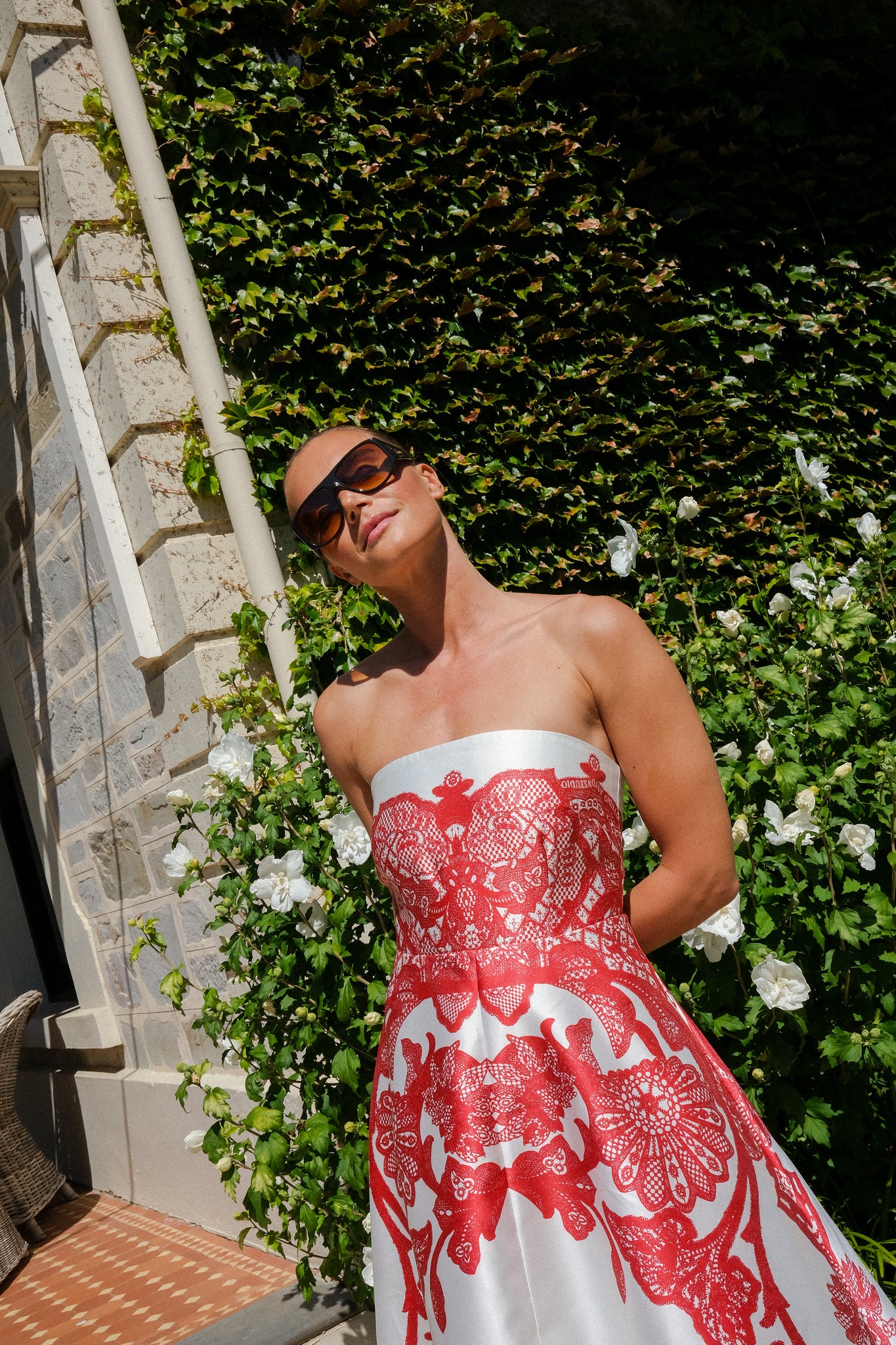 The Audrey Gown Ruby Antique is defined by a structured bodice and voluminous full skirt. Set against a lustrous satin base, the red embroidery print sophisticated contrast.