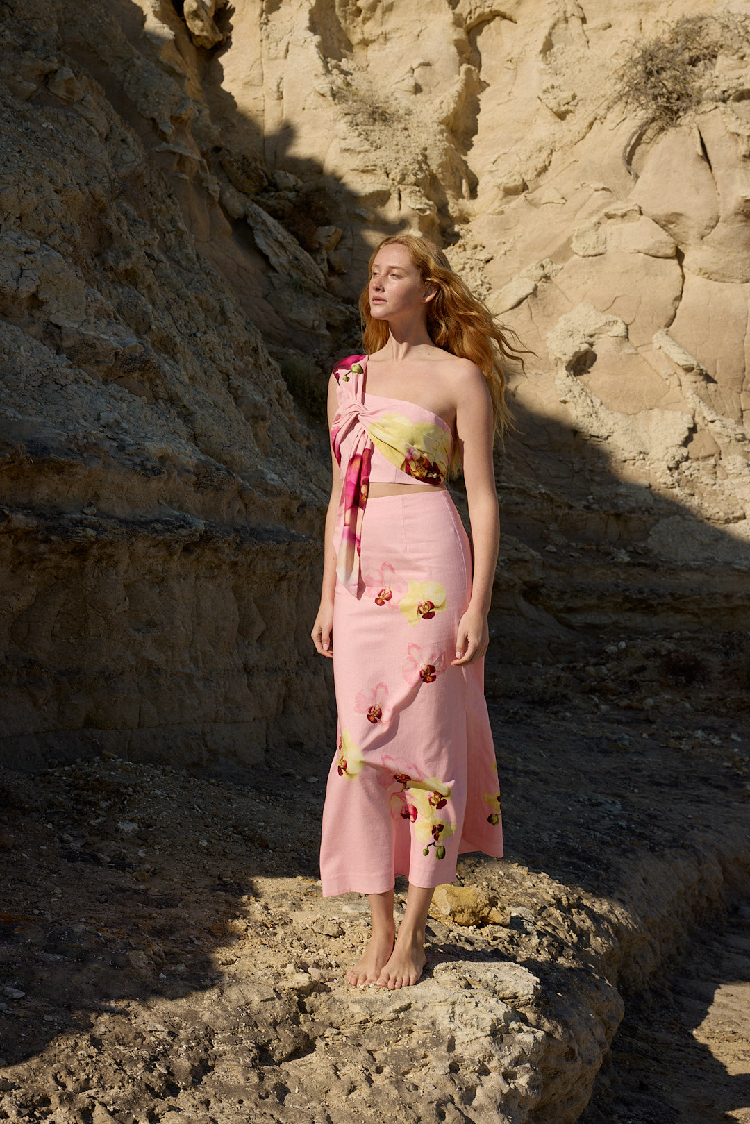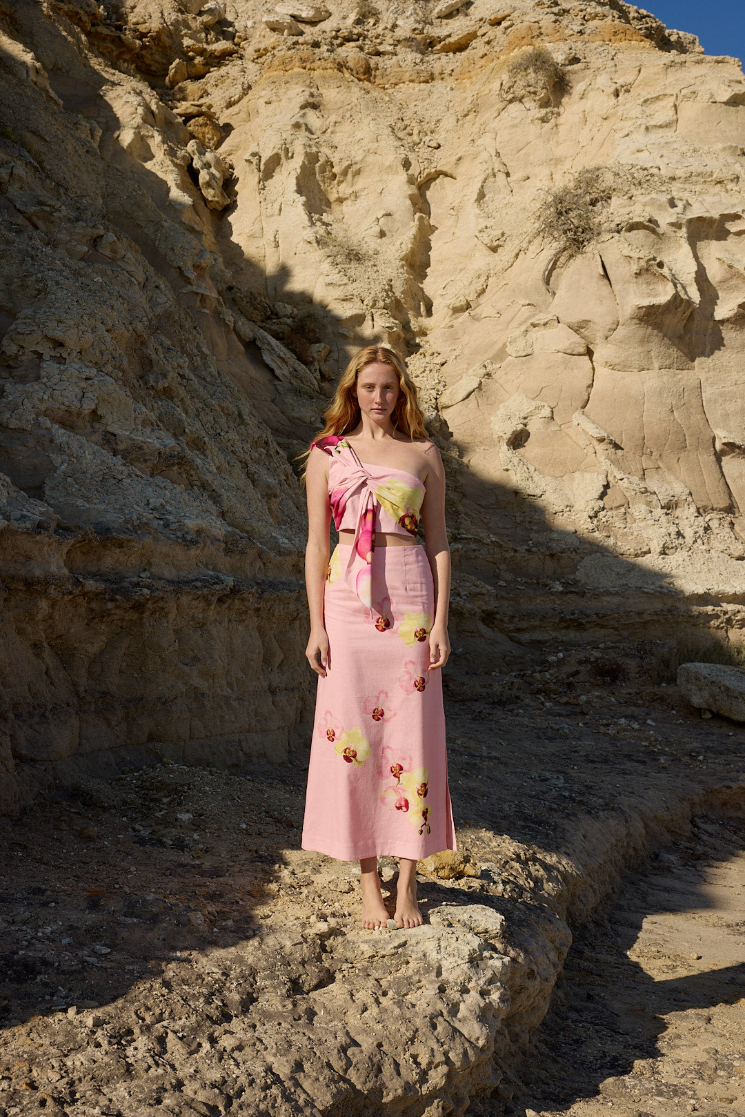 With a one-shoulder design and soft, structured fit, the Maya Top Icing Phalae is effortlessly feminine and a little bold. With a hand crafted Phalae print and a mock tie back, this top is the hero piece your summer wardrobe has been missing.