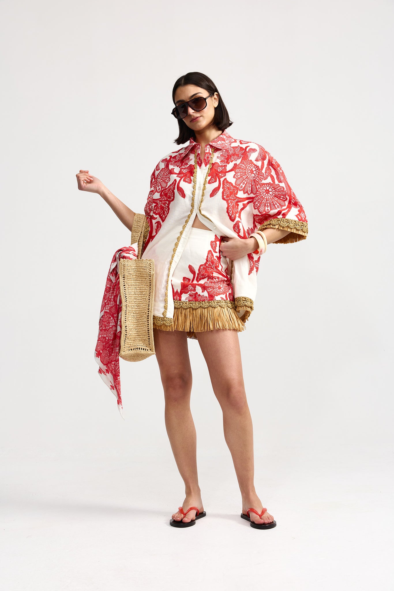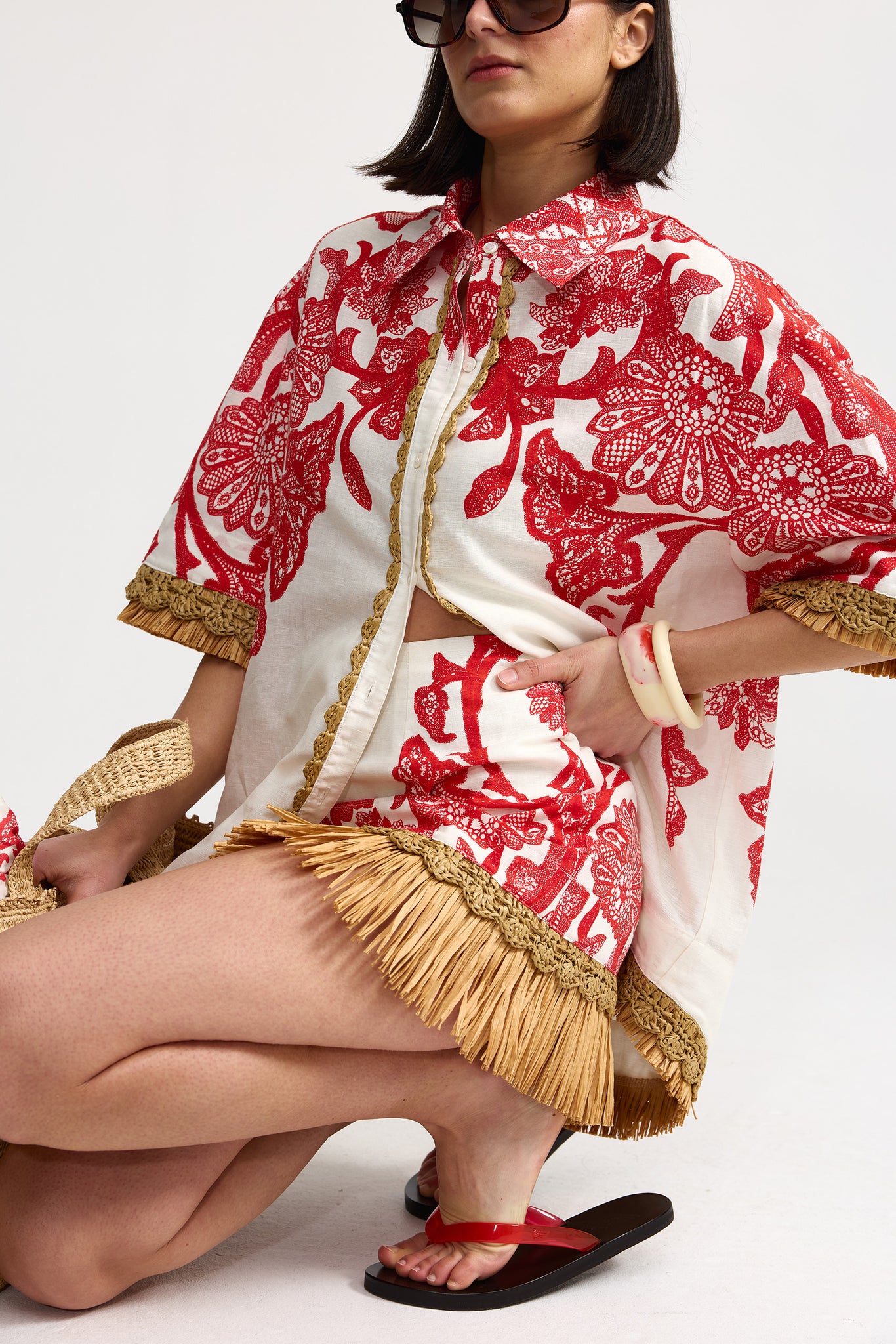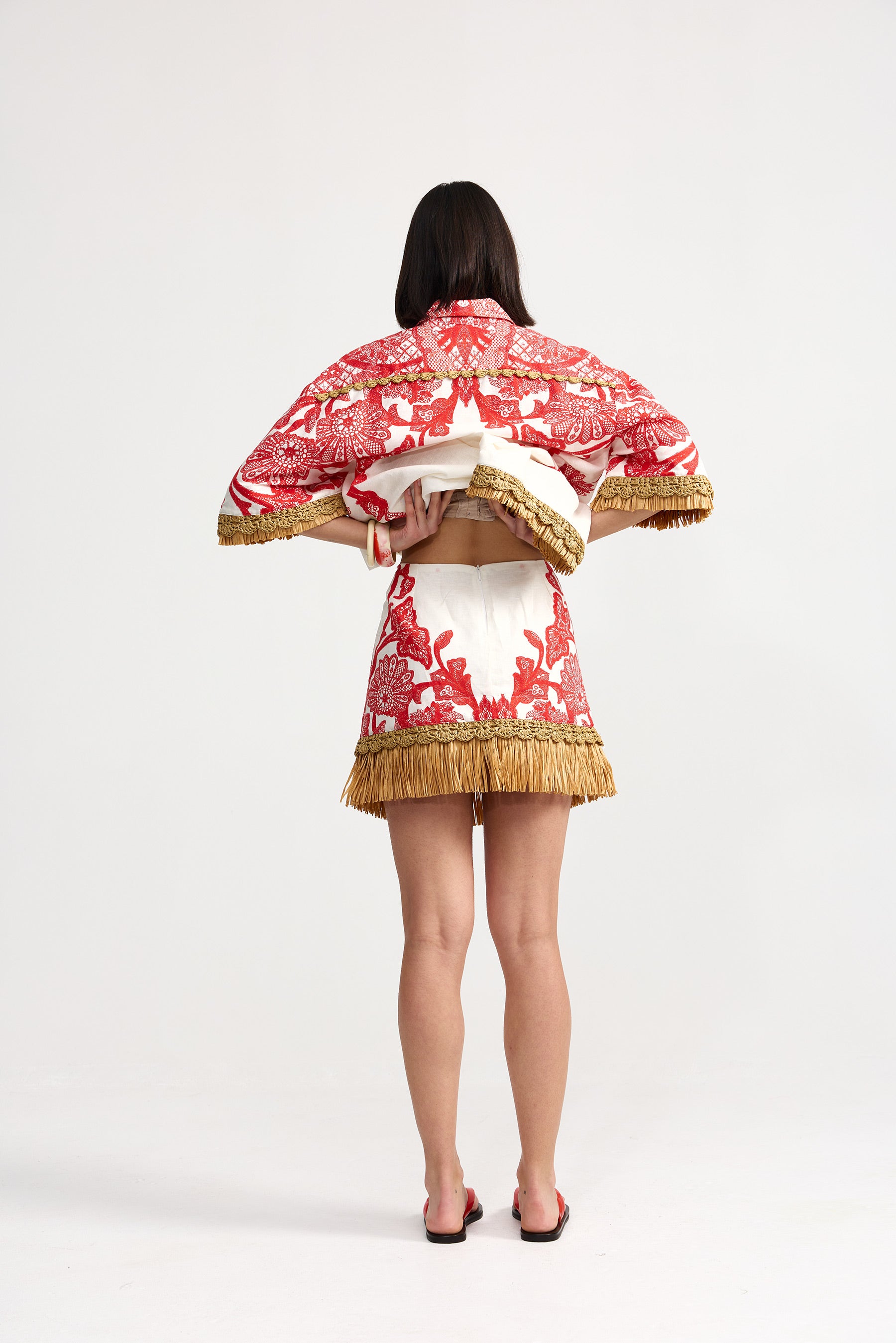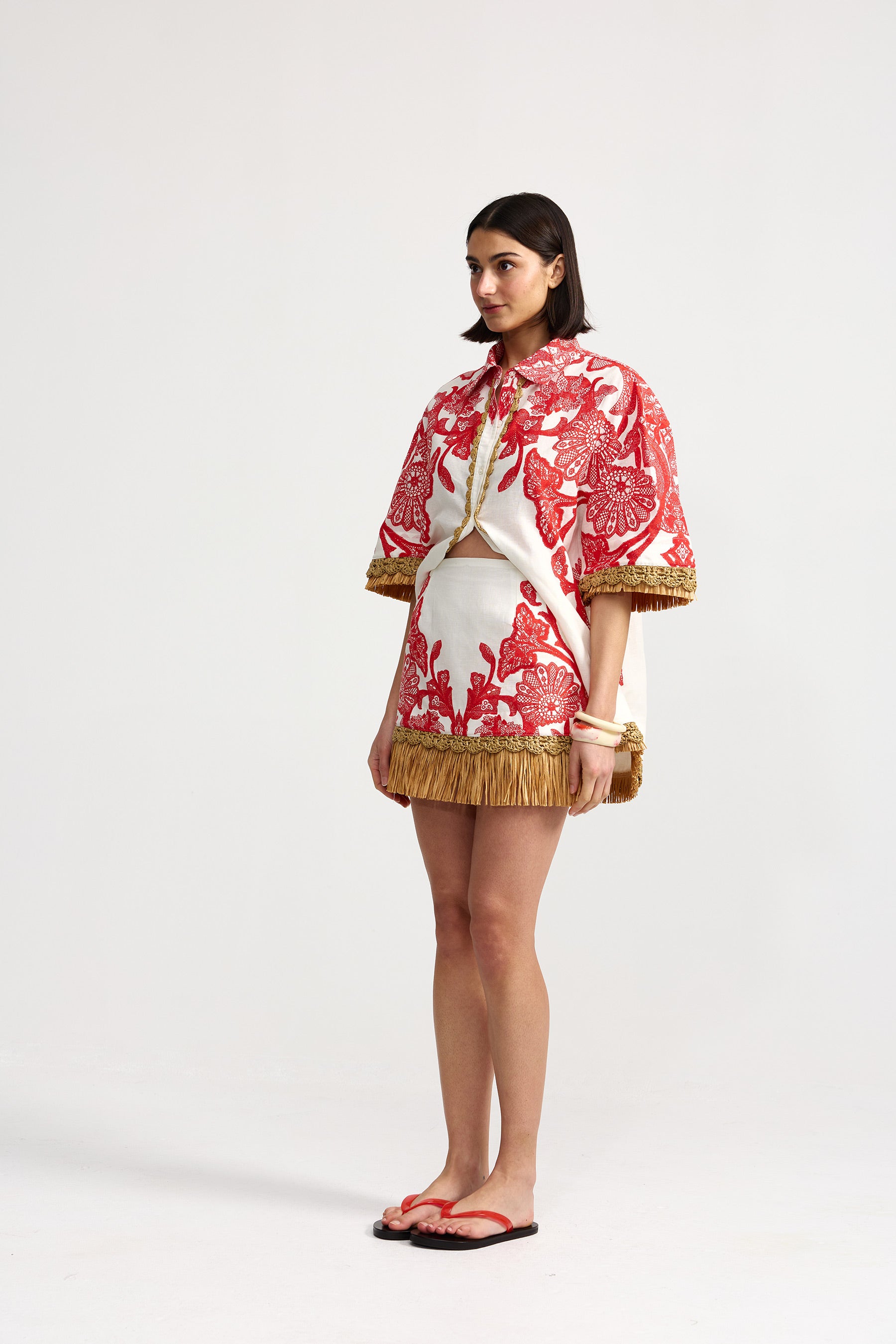 Turn heads wherever you go in the Amity Skirt Ruby Antique. The considered ruby lace placement print and raffia-trimmed hem make it a piece that turns heads. Wear it with a simple top to let the skirt shine, or style boldly with the matching Remy Shirt.