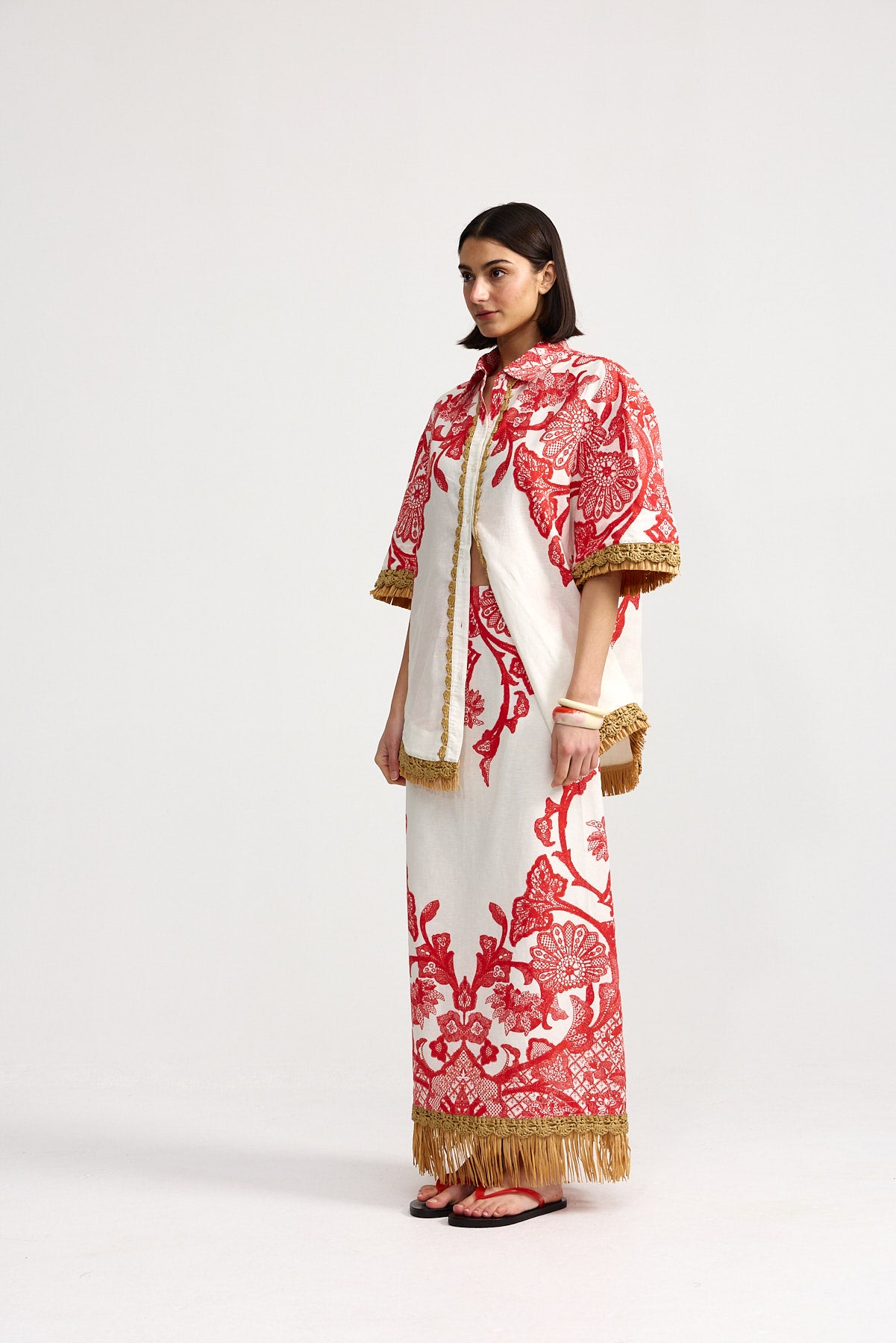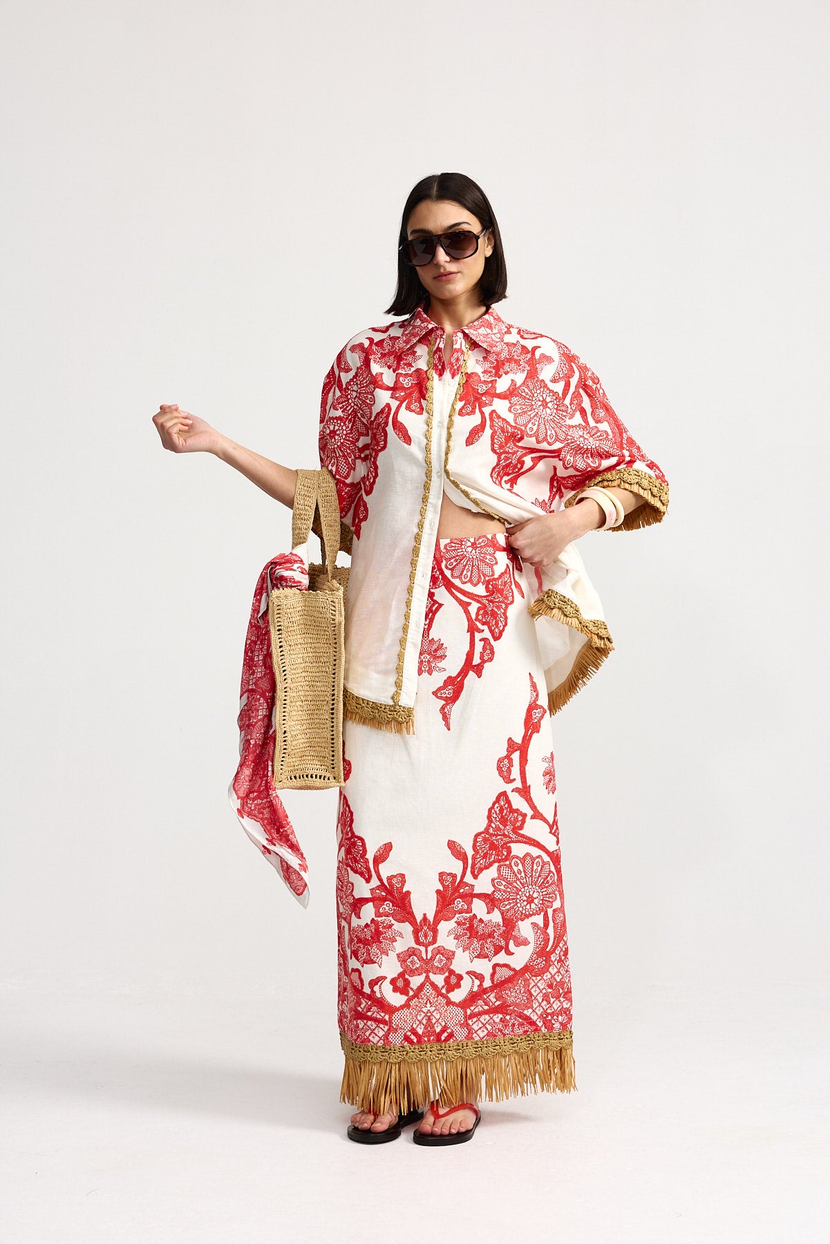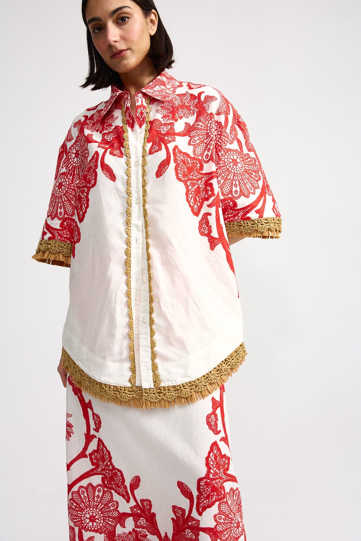 The Remy Shirt Ruby Antique is crafted from a luxurious linen blend, offering a soft, lightweight feel and a draped silhouette. Featuring our hand crafted Ruby Antique print and raffia trim detailing, this piece brings effortless edge to your wardrobe.